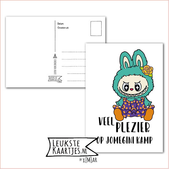 Kaart Op Kamp -> JoMeGiNi – Thuisblijvers No: 72 /6-5 (Veel plezier op JoMeGiNi kamp – Monster-Labubu-stijl in paars pak)