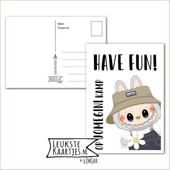 Kaart Op Kamp -> JoMeGiNi – Thuisblijvers No: 73 /6-6 (Have fun! op JoMeGiNi kamp – Monster-Labubu-stijl met pet)